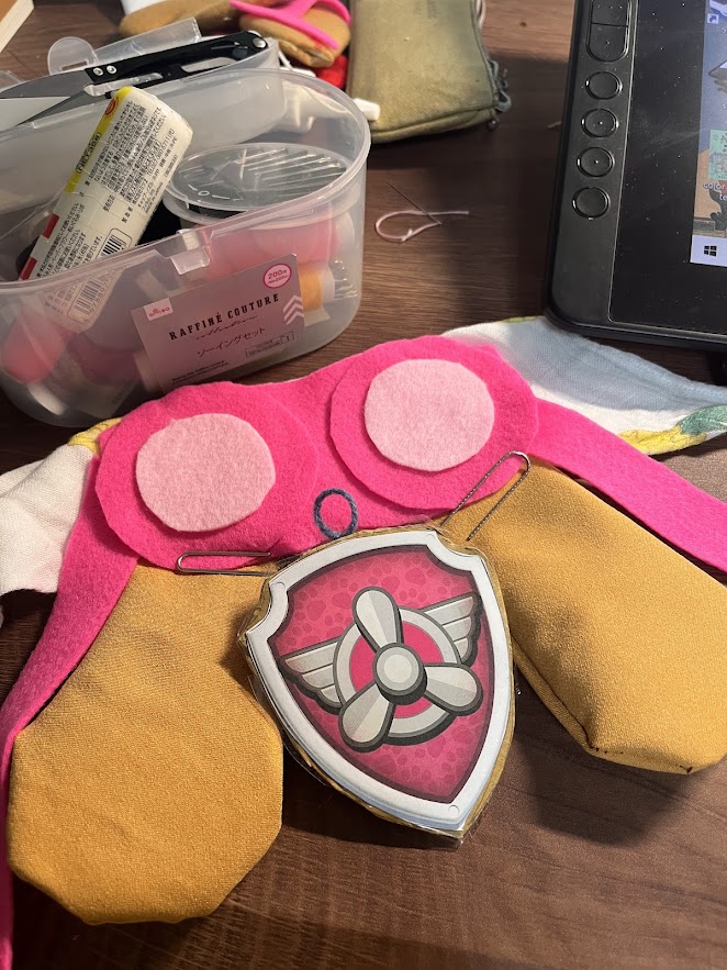 先是拿了肉球小時候用的口水巾當底,上面防風眼鏡的部分用兩款相近色的粉紅不織布黏貼縫合,耳朵的部分用了之前自己修理劍道小手的餘料兩片縫合。耳朵裡面原本想塞進棉花讓它有一些立體度,後來怕戴著太重而作罷。