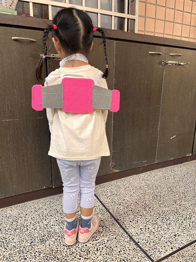 飛行背包的部分運用兩片厚紙板裁切形狀,有一定的厚度夠堅固。機翼兩側同樣黏貼粉紅色的不織布,中間翅膀加上銀色特殊紙,最後背後用兩條鬆緊帶加透明膠帶黏貼上去就完成了!